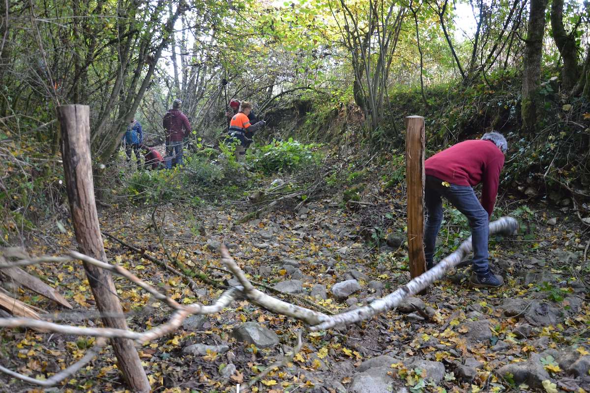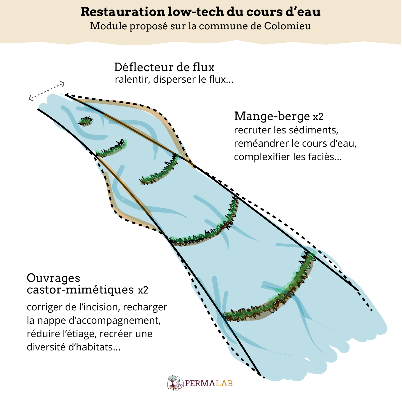 Un chantier participatif de 2 jours a été organisé par la commune et animé conjointement par Cédric Cadet et Brice le Maire de l’ Association MAPCa pour des rivières vivantes et Félix Grippon de PermaLab.