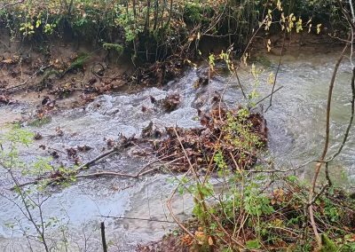 La rivière était encore à sec au moment du chantier, mais la rivière n’a pas mis longtemps à répondre puisque deux jours après le cours d’eau était en hautes eaux, avec déjà l’observation des premiers effets : réduction de la section d’écoulement provoquée par les manges-berges provoquant un flux important contre les berges, et sédiments commençant à s’accumuler en amont des ouvrages.